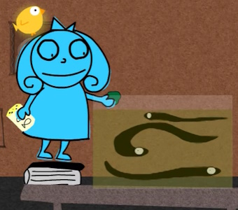 That weekend, while Vendetta is supposedly "away" (she's hiding out in her house spying), Charlotte arrives with Frederick the canary tagging along. Using the written instructions provided by Vendetta, the blue girl successfully feeds all of the fiends, including but not limited to a giant fly trap (which Charlotte accidentally kills by feeding it a cupcake), electric eels, one-eyed bats, and a grizzly bear. This is all shown via a montage, which Charlotte sings over. Vendetta watches her the whole time without being noticed (even when it's REALLY obvious she's there)